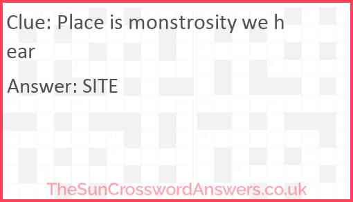Place is monstrosity we hear is a crossword clue for which we have 1 possible answer and we have spotted 4 times in our database. This crossword clue was last seen on 03 November 2023 in The Sun Cryptic Crossword puzzle!