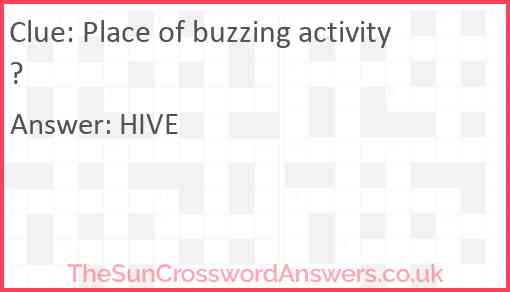 Place of buzzing activity? is a crossword clue for which we have 1 possible answer and we have spotted 1 times in our database. This crossword clue was last seen on 26 March 2024 in The Sun Cryptic Crossword puzzle!