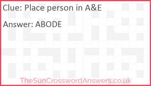 Place person in A&E is a crossword clue for which we have 1 possible answer and we have spotted 4 times in our database. This crossword clue was last seen on 23 January 2024 in The Sun Cryptic Crossword puzzle!