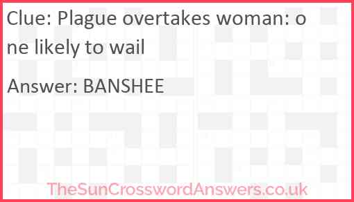 Plague overtakes woman: one likely to wail is a crossword clue for which we have 1 possible answer and we have spotted 1 times in our database. This crossword clue was last seen on 24 February 2022 in The Sun Cryptic Crossword puzzle!