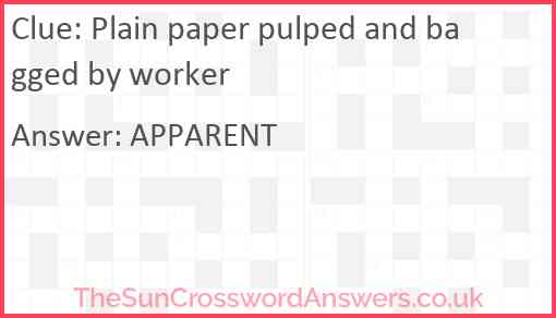 Plain paper pulped and bagged by worker is a crossword clue for which we have 1 possible answer and we have spotted 3 times in our database. This crossword clue was last seen on 09 August 2024 in The Sun Cryptic Crossword puzzle!