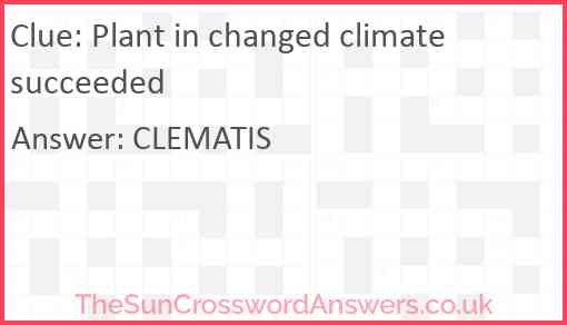Plant in changed climate succeeded is a crossword clue for which we have 1 possible answer and we have spotted 1 times in our database. This crossword clue was last seen on 26 October 2020 in The Sun Cryptic Crossword puzzle!