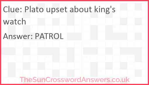 Plato upset about king's watch is a crossword clue for which we have 1 possible answer and we have spotted 1 times in our database. This crossword clue was last seen on 07 August 2021 in The Sun Cryptic Crossword puzzle!