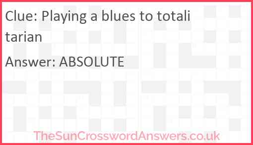 Playing a blues to totalitarian is a crossword clue for which we have 1 possible answer and we have spotted 2 times in our database. This crossword clue was last seen on 08 February 2025 in The Sun Cryptic Crossword puzzle!