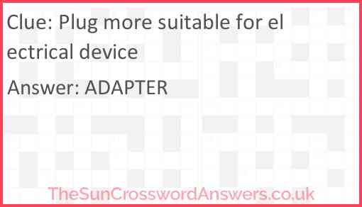 Plug more suitable for electrical device is a crossword clue for which we have 1 possible answer and we have spotted 2 times in our database. This crossword clue was last seen on 21 March 2024 in The Sun Cryptic Crossword puzzle!