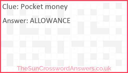 Pocket money is a crossword clue for which we have 1 possible answer and we have spotted 2 times in our database. This crossword clue was last seen on 24 January 2025 in The Sun Coffee Time Crossword puzzle!