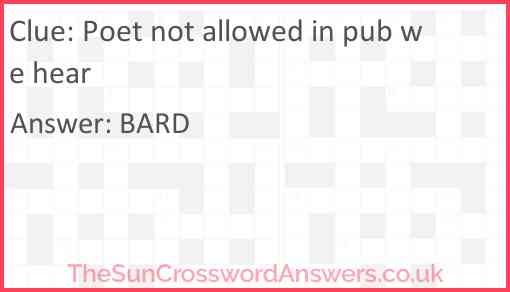 Poet not allowed in pub we hear is a crossword clue for which we have 1 possible answer and we have spotted 2 times in our database. This crossword clue was last seen on 11 December 2022 in The Sun Cryptic Crossword puzzle!