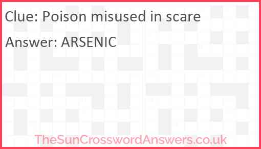 Poison misused in scare is a crossword clue for which we have 1 possible answer and we have spotted 3 times in our database. This crossword clue was last seen on 25 December 2024 in The Sun Cryptic Crossword puzzle!