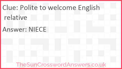 Polite to welcome English relative is a crossword clue for which we have 1 possible answer and we have spotted 2 times in our database. This crossword clue was last seen on 16 January 2025 in The Sun Cryptic Crossword puzzle!