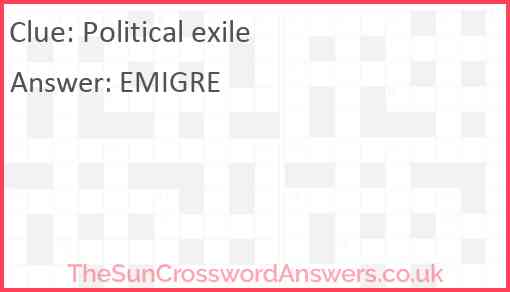 Political exile is a crossword clue for which we have 1 possible answer and we have spotted 1 times in our database. This crossword clue was last seen on 06 February 2022 in The Sun Coffee Time Crossword puzzle!