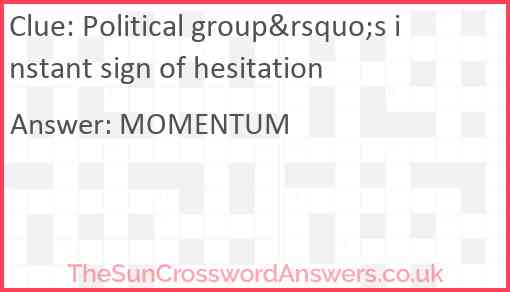 Political group’s instant sign of hesitation is a crossword clue for which we have 1 possible answer and we have spotted 1 times in our database. This crossword clue was last seen on 10 April 2022 in The Sun Cryptic Crossword puzzle!