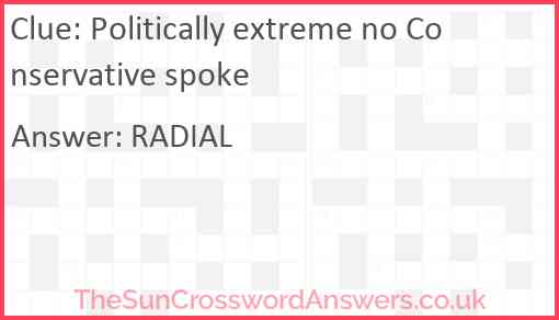 Politically extreme no Conservative spoke is a crossword clue for which we have 1 possible answer and we have spotted 3 times in our database. This crossword clue was last seen on 01 January 2025 in The Sun Cryptic Crossword puzzle!