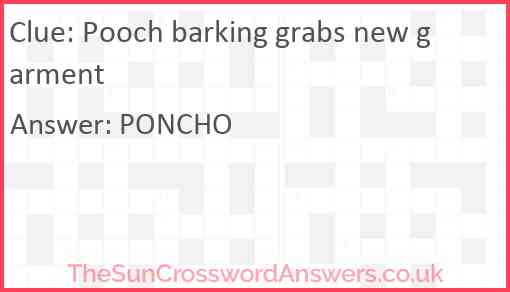 Pooch barking grabs new garment is a crossword clue for which we have 1 possible answer and we have spotted 1 times in our database. This crossword clue was last seen on 28 March 2021 in The Sun Cryptic Crossword puzzle!