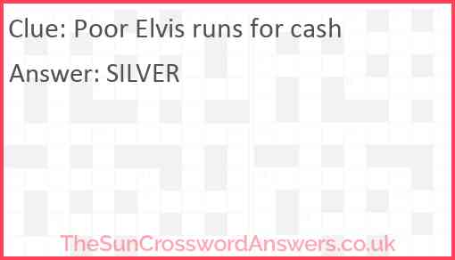 Poor Elvis runs for cash is a crossword clue for which we have 1 possible answer and we have spotted 2 times in our database. This crossword clue was last seen on 12 February 2022 in The Sun Cryptic Crossword puzzle!