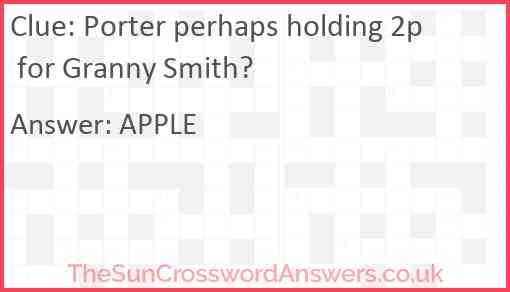 Porter perhaps holding 2p for Granny Smith? is a crossword clue for which we have 1 possible answer and we have spotted 1 times in our database. This crossword clue was last seen on 10 November 2019 in The Sun Cryptic Crossword puzzle!