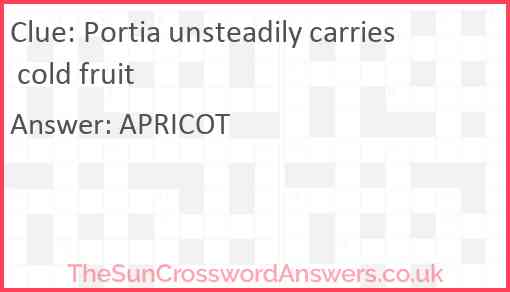 Portia unsteadily carries cold fruit is a crossword clue for which we have 1 possible answer and we have spotted 4 times in our database. This crossword clue was last seen on 25 February 2025 in The Sun Cryptic Crossword puzzle!