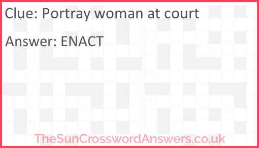 Portray woman at court is a crossword clue for which we have 1 possible answer and we have spotted 2 times in our database. This crossword clue was last seen on 30 August 2023 in The Sun Cryptic Crossword puzzle!