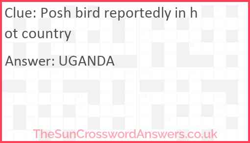Posh bird reportedly in hot country is a crossword clue for which we have 1 possible answer and we have spotted 1 times in our database. This crossword clue was last seen on 13 September 2020 in The Sun Cryptic Crossword puzzle!