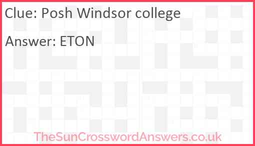 Posh Windsor college is a crossword clue for which we have 1 possible answer and we have spotted 1 times in our database. This crossword clue was last seen on 17 November 2024 in The Sun Coffee Time Crossword puzzle!