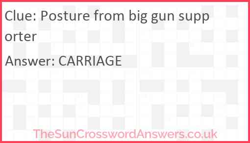 Posture from big gun supporter is a crossword clue for which we have 1 possible answer and we have spotted 2 times in our database. This crossword clue was last seen on 20 May 2023 in The Sun Cryptic Crossword puzzle!