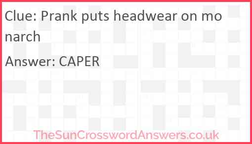 Prank puts headwear on monarch is a crossword clue for which we have 1 possible answer and we have spotted 1 times in our database. This crossword clue was last seen on 07 November 2019 in The Sun Cryptic Crossword puzzle!