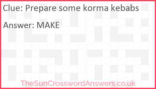 Prepare some korma kebabs is a crossword clue for which we have 1 possible answer and we have spotted 2 times in our database. This crossword clue was last seen on 04 December 2023 in The Sun Cryptic Crossword puzzle!