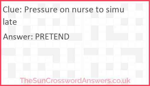Pressure on nurse to simulate is a crossword clue for which we have 1 possible answer and we have spotted 2 times in our database. This crossword clue was last seen on 17 December 2020 in The Sun Cryptic Crossword puzzle!