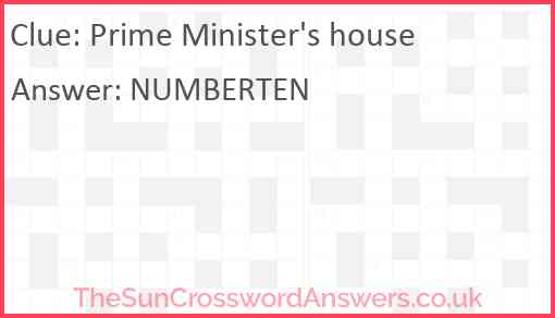 Prime Minister's house is a crossword clue for which we have 1 possible answer and we have spotted 2 times in our database. This crossword clue was last seen on 24 April 2021 in The Sun Coffee Time Crossword puzzle!