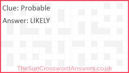 Probable is a crossword clue for which we have 1 possible answer and we have spotted 2 times in our database. This crossword clue was last seen on 26 January 2023 in The Sun Coffee Time Crossword puzzle!