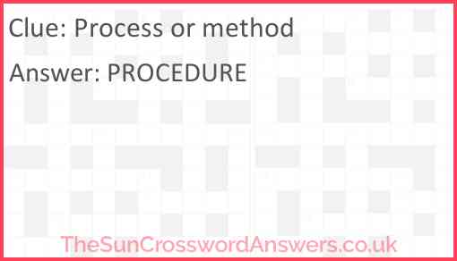 Process or method is a crossword clue for which we have 1 possible answer and we have spotted 3 times in our database. This crossword clue was last seen on 09 May 2024 in The Sun Coffee Time Crossword puzzle!