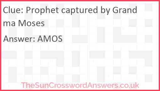 Prophet captured by Grandma Moses is a crossword clue for which we have 1 possible answer and we have spotted 2 times in our database. This crossword clue was last seen on 17 December 2024 in The Sun Cryptic Crossword puzzle!