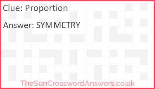 Proportion is a crossword clue for which we have 2 possible answer and we have spotted 6 times in our database. This crossword clue was last seen on 04 June 2025 in The Sun Coffee Time Crossword puzzle!