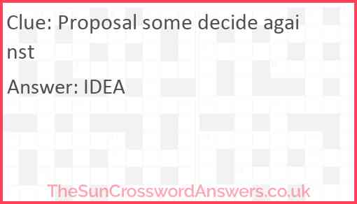 Proposal some decide against is a crossword clue for which we have 1 possible answer and we have spotted 3 times in our database. This crossword clue was last seen on 01 June 2022 in The Sun Cryptic Crossword puzzle!