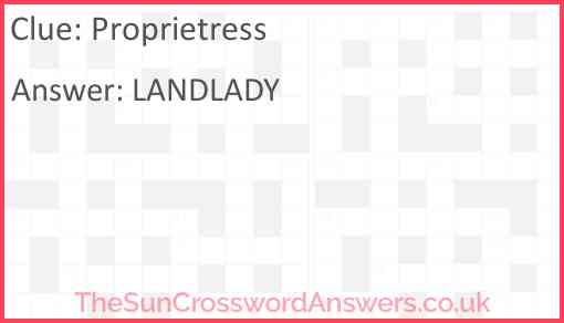Proprietress is a crossword clue for which we have 1 possible answer and we have spotted 3 times in our database. This crossword clue was last seen on 21 April 2024 in The Sun Coffee Time Crossword puzzle!