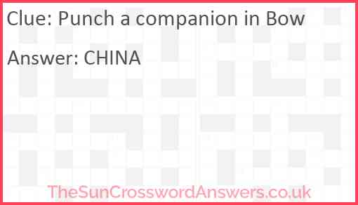 Punch a companion in Bow is a crossword clue for which we have 1 possible answer and we have spotted 1 times in our database. This crossword clue was last seen on 19 May 2019 in The Sun Cryptic Crossword puzzle!