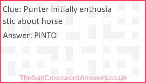 Punter initially enthusiastic about horse is a crossword clue for which we have 1 possible answer and we have spotted 1 times in our database. This crossword clue was last seen on 05 January 2025 in The Sun Cryptic Crossword puzzle!
