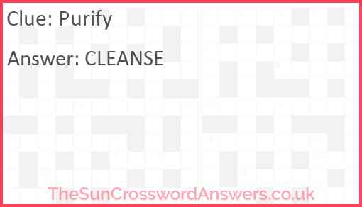 Purify is a crossword clue for which we have 1 possible answer and we have spotted 4 times in our database. This crossword clue was last seen on 14 July 2025 in The Sun Coffee Time Crossword puzzle!