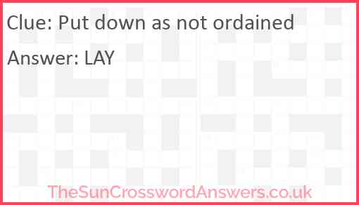Put down as not ordained is a crossword clue for which we have 1 possible answer and we have spotted 5 times in our database. This crossword clue was last seen on 10 January 2025 in The Sun Cryptic Crossword puzzle!