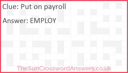 Put on payroll is a crossword clue for which we have 1 possible answer and we have spotted 5 times in our database. This crossword clue was last seen on 30 April 2023 in The Sun Coffee Time Crossword puzzle!