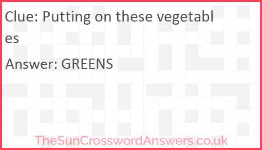 Putting on these vegetables is a crossword clue for which we have 1 possible answer and we have spotted 4 times in our database. This crossword clue was last seen on 09 July 2024 in The Sun Cryptic Crossword puzzle!