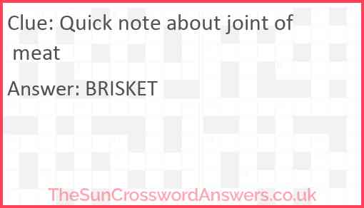 Quick note about joint of meat is a crossword clue for which we have 1 possible answer and we have spotted 2 times in our database. This crossword clue was last seen on 20 December 2023 in The Sun Cryptic Crossword puzzle!