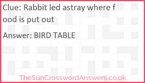 Rabbit led astray where food is put out is a crossword clue for which we have 2 possible answer and we have spotted 2 times in our database. This crossword clue was last seen on 10 May 2023 in The Sun Cryptic Crossword puzzle!