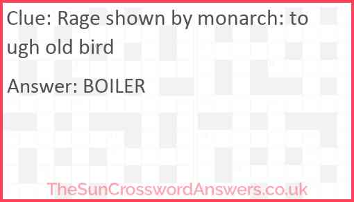 Rage shown by monarch: tough old bird is a crossword clue for which we have 1 possible answer and we have spotted 3 times in our database. This crossword clue was last seen on 25 December 2021 in The Sun Cryptic Crossword puzzle!