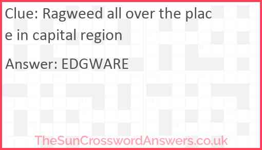 Ragweed all over the place in capital region is a crossword clue for which we have 1 possible answer and we have spotted 1 times in our database. This crossword clue was last seen on 01 February 2024 in The Sun Cryptic Crossword puzzle!