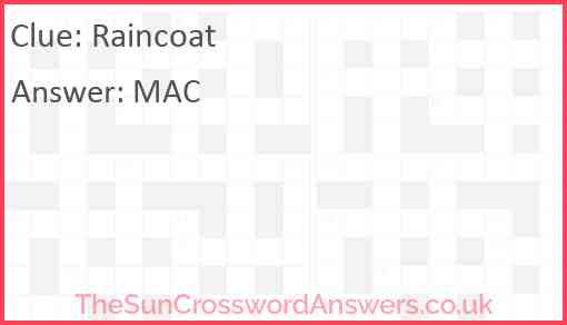 Raincoat is a crossword clue for which we have 1 possible answer and we have spotted 4 times in our database. This crossword clue was last seen on 03 April 2024 in The Sun Coffee Time Crossword puzzle!