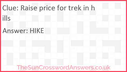 Raise price for trek in hills is a crossword clue for which we have 1 possible answer and we have spotted 2 times in our database. This crossword clue was last seen on 14 February 2024 in The Sun Cryptic Crossword puzzle!