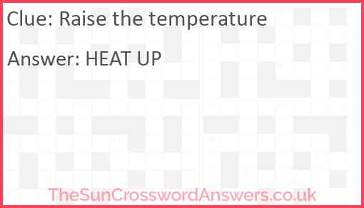 Raise the temperature is a crossword clue for which we have 1 possible answer and we have spotted 1 times in our database. This crossword clue was last seen on 07 March 2019 in The Sun Coffee Time Crossword puzzle!