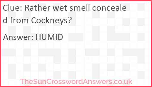 Rather wet smell concealed from Cockneys? is a crossword clue for which we have 1 possible answer and we have spotted 1 times in our database. This crossword clue was last seen on 12 January 2023 in The Sun Cryptic Crossword puzzle!