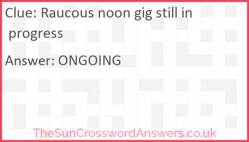 Raucous noon gig still in progress is a crossword clue for which we have 1 possible answer and we have spotted 2 times in our database. This crossword clue was last seen on 06 June 2024 in The Sun Cryptic Crossword puzzle!