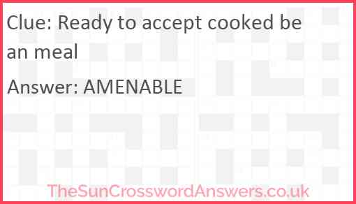 Ready to accept cooked bean meal is a crossword clue for which we have 1 possible answer and we have spotted 1 times in our database. This crossword clue was last seen on 12 August 2024 in The Sun Cryptic Crossword puzzle!